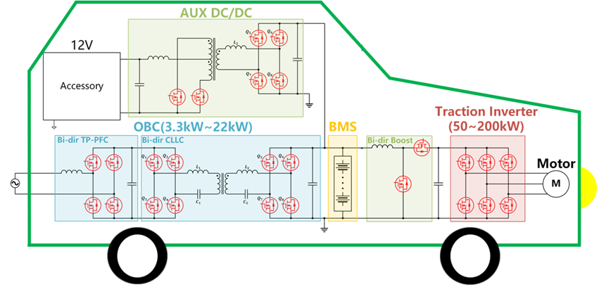 SJ MOSFET 是汽车电动化后的动力总成部分的新增器件类型,主要应用于DC-DC 电源与车载充电器(OBC)中。在动力总成部分,汽车电动化后以电制动的方式使得动力相关的电源如 DC-DC 、车载充电器以及逆变器等功率提升。